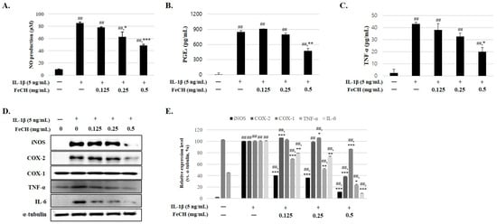 2.3. Inhibitory Effect of FeCH on IL-1β-Induced Expression of NO, iNOS, COX-2, COX-1, TNF-α, IL-6, and PGE2 in RC