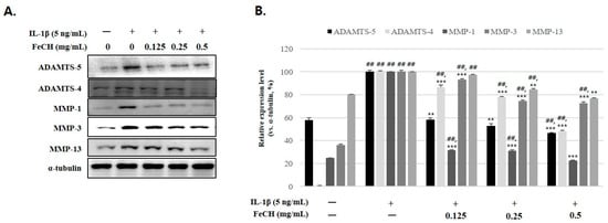 Inhibitory effects of FeCH on IL-1β-induced ADAMTS-5 and -4 and MMP-1, -3, and -13 in primary rat chondrocytes. Primary rat chondrocytes were pretreated with FeCH (0.125, 0.25, and 0.5 mg/mL) for 1 h, followed by IL-1β (5 ng/mL) for 24 h. (A) Protein levels of matrix-degrading enzymes (ADAMTS-5 and -4 and MMP-1, -3, and -13) was determined by western blot. (B) Quantitative data of (A) were analyzed using Image J software. Data are represented as mean ± SD of three independent experiments. α-tubulin served as an internal control. ## p < 0.01 vs. control; ** p < 0.01, and *** p < 0.001 vs. IL-1β-treated group.
