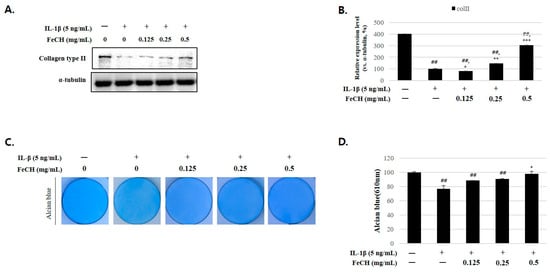 Effect of FeCH on collagen type II and proteoglycan in IL-1β-stimulated primary rat chondrocytes. Primary rat chondrocytes were pretreated with FeCH (0.125, 0.25, and 0.5 mg/mL) for 1 h, followed by IL-1β (5 ng/mL) for 24 h. (A) Protein levels of collagen type II degradation were determined by western blot. (B) Quantitative data of (A) were analyzed using Image J software. (C) Proteoglycan degradation was determined by alcian blue stain. (D) After dissolving alcian blue dye in 6M guanidine-HCL, the absorbance at 620 nm was measured. Data are represented as mean ± SD of three independent experiments. α-tubulin served as an internal control. ## p < 0.01 vs. control; * p < 0.05, ** p < 0.01, and *** p < 0.001 vs. IL-1β-treated group.