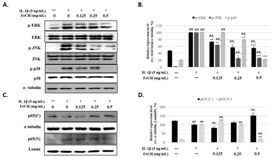 To analyze the mechanism of the chondroprotective effect of 30% FeCH, the phosphorylation of MAPKs (ERK, JNK, p38) and the activity of NF-κB p65 subunit were analyzed using western blot. IL-1β phosphorylation of MAPKs, including ERK, JNK, and p38, was activated when inflammation was induced. However, pretreatment with the FeCH extract inhibited the phosphorylation of ERK, JNK, and p38 (Figure 5A,B). IL-1β induces phosphorylation of NF-κB p65, followed by nuclear translocation (Figure 5C,D). In contrast, pretreatment of chondrocytes with FeCH inhibited NF-κB p65 phosphorylation and nuclear migration (Figure 5C,D).