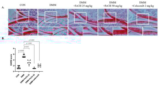 Histological evaluation of cartilage-protective effect of FeCH against cartilage degradation in a DMM model. (A) In vivo schemic (×100). White box indicates the enlarged area. (B) Rats underwent surgical destabilization of the medial meniscus (DMM). The day after the DMM surgery, rats were orally administered with FeCH (25 and 50 mg/kg) or celecoxib (2 mg/kg) daily for 8 weeks. Histological analysis of cartilage destruction was evaluated by safranin O/fast green staining.