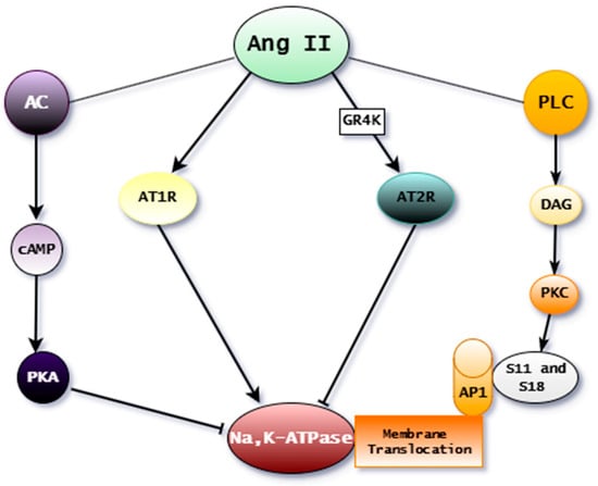 - Bharatula, M.; Hussain, T.; Lokhandwala, M.F. Angiotensin II AT1 Receptor/Signaling Mechanisms in the Biphasic Effect of the Peptide on Proximal Tubular Na+, K+-ATPase. Clin. Exp. Hypertens. 1998, 20, 465–480. [Google Scholar] [CrossRef]
