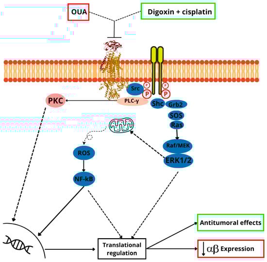 - Pereira, D.G.; Salgado, M.A.R.; Rocha, S.C.; Santos, H.L.; Villar, J.A.F.P.; Contreras, R.G.; Fontes, C.F.L.; Barbosa, L.A.; Cortes, V.F. Involvement of Src Signaling in the Synergistic Effect between Cisplatin and Digoxin on Cancer Cell Viability. J. Cell Biochem. 2018, 119, 3352–3362. [Google Scholar] [CrossRef]