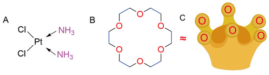 Chemical structure of cisplatin (A) and 18-crown-6 (B), and “crown” shaped like 18-crown-6 (C).