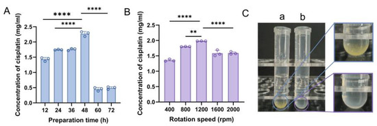 The optimization of preparation time (A) and rotation rate (B) of DDP@18-crown-6 complex (n = 3) and optical photograph of cisplatin dispersed or dissolved (C) in ultrapure water (a) or 18-crown-6 aqueous solution (b). ANOVA or t tests were utilized to determine whether there are significant differences between the data. p value style: ** p < 0.01; **** p < 0.0001.