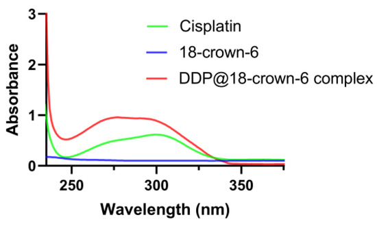 The UV–visible spectrogram of cisplatin, 18-crown-6, and the DDP@18-crown-6 complex.