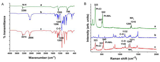 The FT-IR spectrogram (A) and Raman spectrogram (B) of cisplatin (a), 18-crown-6 (b), and DDP@18-crown-6 complex (c).