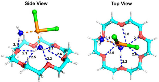 The optimal binding conformation of DDP and 18-crown-6 is illustrated in Figure 5. Specifically, the interaction involved hydrogen bonding between the -NH3 ligands of DDP and the oxygen atoms of 18-crown-6, forming a hydrogen bonding network (indicated by blue dashed lines) and resulting in the DDP@18-crown-6 complex. This configuration aligned with the above experimental observations. The hydrogen bonding bond lengths between the two molecules (ranging from 2.1 to 2.8 Å) are labeled on the blue dashed line in Figure 5 by molecular docking. Probably due to the presence of two -NH3 ligands, DDP preferred to bind on the side of 18-crown-6. At the same time, from the top view, DDP was not at the median position of 18-crown-6, but was slightly off. This fitted structure is also shown with the bond length of hydrogen bonding. Calculations revealed a binding energy (ΔE) of −2.63 kcal/mol, indicating a robust electrostatic-driven hydrogen bonding interaction [40]. The abovementioned UV–visible spectroscopy revealed that the hydrogen bond network between the two compounds enhanced the solubility of DDP to some extent.