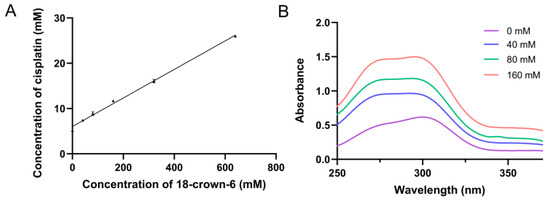 Solubility analysis was conducted following the method of Higuchi and Conners [31,38,56]. Excess DDP was added to 3 mL of aqueous 18-crown-6 solutions at varying concentrations (0, 40, 80, 160, 320, and 640 mM). Six samples were stirred at 1200 rpm at room temperature for 48 h. After stirring, the samples were filtered through a Büchner funnel to collect the clear solutions, yielding the DDP@18-crown-6 complex. The absorbance at 301 nm was then measured using a UV–visible spectrophotometer to determine the solubility of DDP in solutions of different 18-crown-6 concentrations (Figure S1).