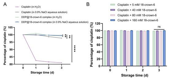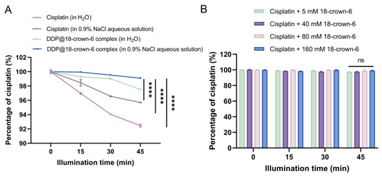 (A) Photostability of cisplatin (in H2O), cisplatin (in 0.9% NaCl aqueous solution), DDP@18-crown-6 complex (in H2O), and DDP@18-crown-6 complex (in 0.9% NaCl aqueous solution); and (B) photostability of cisplatin at different 18-crown-6 concentrations (n = 3). ANOVA or t tests were utilized to determine whether there are significant differences between the data. p value style: ns: not significant (p > 0.05); **** p < 0.0001.
