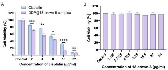 In vitro cytotoxicity of cisplatin and DDP@18-crown-6 complex (A), and 18-crown-6 (B). (n = 3) ANOVA or t tests were utilized to determine whether there are significant differences between the data. p value style: * p < 0.05; ** p < 0.01; *** p < 0.001; **** p < 0.0001.