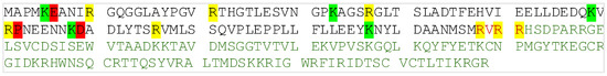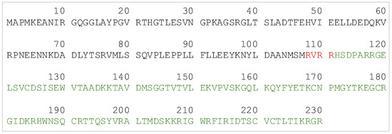 The rhProBDNF amino acid sequence and trypsin cleavage sites. Lysine (K) residues are highlighted in green, while arginines (R) in yellow. Red-highlighted residues are P1’ amino acids impeding trypsin cleavage. Black sequence refers to the Pro-peptide region, while green sequence to mature BDNF.