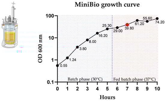 MiniBio microorganism growth curve example, measured by OD600nm. After 5.5 h of culture, at the end of the batch phase, temperature was shifted from 30 °C to 37 °C and the fed-batch phase started. One hour after the temperature increased, corresponding to the red dot on the curve, recombinant protein production was induced by the addition of IPTG. Fermentation was then continued for a further three hours. Fermentator icon was created with BioRender.