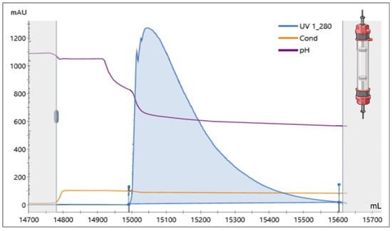 MEP column typical elution profile. After loading and washing to baseline, the protein is eluted as a single peak by dropping the pH to 4. The blue line identifies the UV detection at 280 nm, the orange line refers to the measured conductivity, while the purple line identifies the pH. Chromatography column icon was created with BioRender.