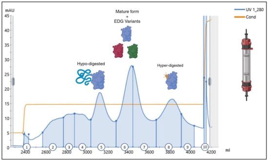 Of note, in this chromatography we observed that, in the central portion, which is supposed to contain the mature BDNF, the protein of interest was present, but only in marginal quantities and heavily contaminated by the hyperdigested variant, that represented up to 50% of the eluted material. We also observed an important peak in the column wash with 2 M NaCl (fraction 10), corresponding to a high percentage of the loaded material (Table 2). Mass spectrometry analysis revealed that the material present in this last chromatographic peak mainly contains two enzymatic digestion variants (EDG) with a similar fractional abundance, and corresponding to R111-BDNF (27%, namely EDG-V1) and V109R110R111-BDNF (26%, namely EDG-V2). Only a small percentage of the correctly digested mature BDNF (9%) and the hyperdigested variant (13%, ΔHSDPAR), together with other less abundant forms (oxidized, deaminated, modified, or other minor hypodigested variants) were detected by mass spectrometry (see the Supplementary Materials).