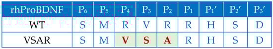 Hinge region amino-acidic sequences of the rhProBDNF wild-type cleavage site (Furin substrate) and “VSAR” variant (highlighted in red).