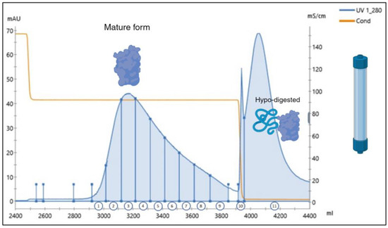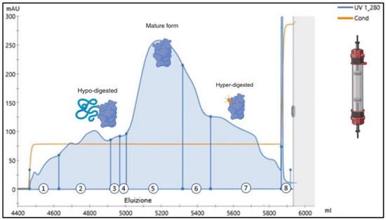 As those results were in line with our expectations, enzymatic reaction was stopped by dropping the pH to 5, a value where trypsin is almost inactive, and the downstream process was continued with a cation exchange chromatography. For this, a column packed with sulphopropyl (SP) Sepharose (Cytiva) resin, pre-equilibrated at pH 5, was loaded with the digested material, washed, and finally eluted with a salt step. Elution peaks were fractionated and analyzed by the RP-UPLC. With this chromatographic approach, the digested material elutes in three different peaks: the first peak, mainly corresponding to the elution of the hypodigested material; the central portion, containing the mature BDNF; the last peak, corresponding to the hyperdigested material (Figure 4).