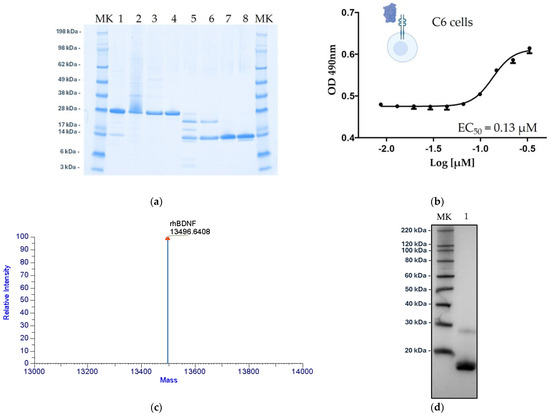 The purified recombinant human mature BDNF was finally characterized by means of chemico-physical, biochemical, and cell biology techniques. To confirm protein identity, purity, and its molecular characterization, SDS-PAGE, western blotting, reversed-phase UPLC, and mass-spectrometry analyses were performed on a rhBDNF sample buffer exchanged in sodium phosphate 50 mM, sodium chloride 100 mM at pH 7.0. As shown in Figure 8a, the rhBDNF migrated as a single band of approximately 13 kDa, on a 4–12% SDS-PAGE gel under reducing conditions (average theoretical mass, 13,511 Da), exhibiting a high level of purity (>95%). Moreover, the western blot analysis indicated that the protein was efficiently recognized by an anti-BDNF human antibody (Figure 8d). The experimental mass was determined by intact molecular weight analysis through LC–MS and the result was 13,496 Da (monoisotopic mass), in perfect agreement with the theoretical one (Figure 8c). The rhBDNF biological activity was finally evaluated by a proliferation assay using C6 rat glial cells expressing the BDNF natural receptor TrkB. The rhBDNF exhibited a typical dose–response curve confirming its functionality and its ability to induce proliferation of Trk-B expressing cells. The rhBDNF half maximal effective concentration (EC50) was determined, as reported in Figure 8b. In addition to this preliminary assay, a more detailed functional in vitro and in vivo characterization to investigate the therapeutical potential of the produced rhBDNF purified protein was performed by Pisani et al. [21].