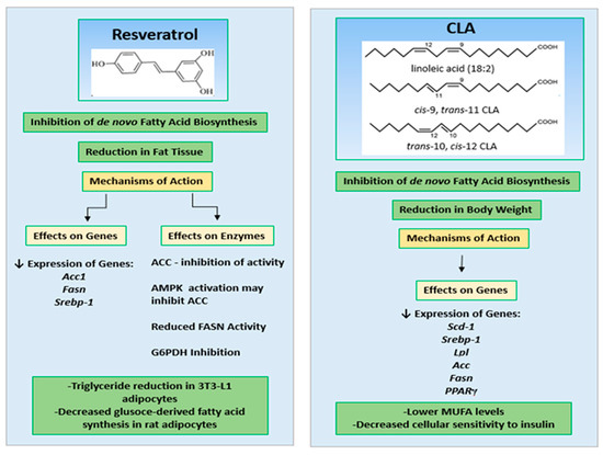 Studies have not extensively explored the effects of combining resveratrol and cis-9, trans-11 CLA. However, Arias et al. [60] demonstrated the efficacy of CLA in reducing adipose tissue in adult Wistar rats that were fed with diet TD.06415 and supplemented with 0.5% CLA for 6 weeks.