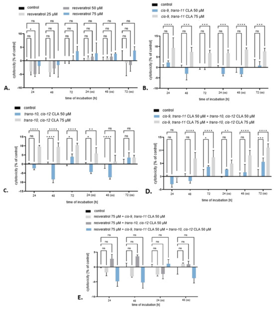 Determination of cytotoxicity in 3T3-L1 adipocytes due to the action of (A) 25, 50 and 75 µM resveratrol; (B) 50 and 75 µM cis-9, trans-11 CLA; (C) 50 and 75 µM trans-10, cis-12 CLA; (D) 50 and 75 µM mixture of cis-9, trans-11 CLA, and trans-10, cis-12 CLA; (E) mixtures of 75 µM resveratrol with 50 µM cis-9, trans-11 CLA, 75 µM resveratrol with 50 µM trans-10, cis-12 CLA, 75 µM resveratrol with 50 µM cis-9, trans-11 CLA and 50 µM trans-10, cis-12 CLA after 24, 48 and 72 h of incubation under standard conditions and AAPH-induced oxidative stress (os); n = 8. Statistical significance of differences measured by Student’s T-test (p < 0.05). (ns p > 0.05; * p < 0.05; ** p < 0.01; *** p < 0.001; **** p < 0.0001).
