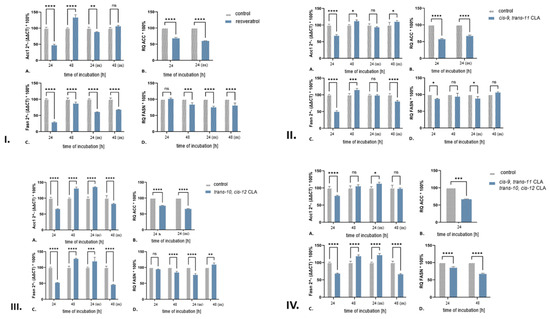 Expression of Acc1 and Fasn genes and ACC and FASN proteins in 3T3-L1 adipocytes treated with: (I). resveratrol (75 µM). (II). cis-9, trans-11 CLA (50 µM) (III). trans-10, cis-12 CLA (50 µM); (IV) a mixture of cis-9, trans-11 CLA (50 µM) and trans-10, cis-12 CLA (50 µM) under standard culture conditions and induced oxidative stress (os). Data are presented relative to controls. A. Acc1 gene expression. B. Amount of ACC protein. C. Fasn gene expression D. FASN protein amount. n = 3. Statistical significance of differences measured by Student’s T-test (ns p > 0.05; * p < 0.05; ** p < 0.01; *** p < 0.001; **** p < 0.0001).