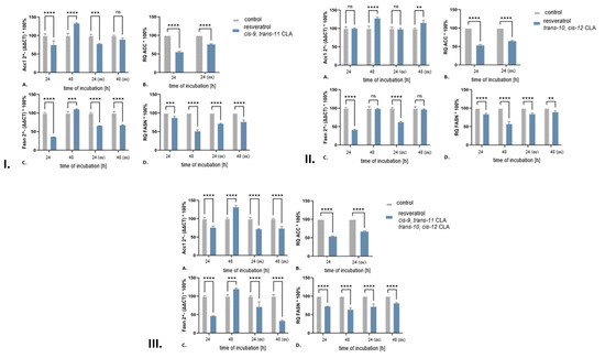 Inducing cells with oxidative stress and treating them with a mixture of resveratrol, cis-9, trans-11 CLA, and trans-10, cis-12 CLA resulted in changes related to the de novo fatty acid biosynthesis process. The observed changes include a decrease in ACC protein quantity and a reduction in the expression of Acc1, Acly, Fasn, and Srebp1 genes (Figure 4 and Table 2). The results obtained led to the conclusion that the mixture’s action under oxidative stress conditions rapidly and durably inhibits the de novo fatty acid biosynthesis process.