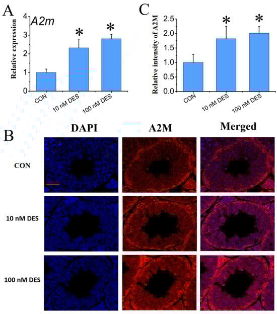 The mRNA levels of A2m were significantly elevated in the presence of 10 and 100 nM DES, as compared with the testes of mice at PND 56 in the control group (p < 0.05) (Figure 1A). Figure S2 shows the immunofluorescence (IF) negative control result, indicating good experimental quality control. At the protein level in situ, multiple IF assays utilizing specific cell markers for Sertoli cells (SOX9) and spermatocytes (DAZL) revealed that A2M is localized in the cytoplasm of germ cells, Leydig cells, and Sertoli cells within the seminiferous tubules, with a marked increase in A2M within the DES-treated groups, indicating respond to estrogen exposure (Figure 1B and Figure S3). Upon further analysis, the relative intensity of A2M was found to be significantly upregulated by 10 and 100 nM DES in the testes of mice at PND 56 relative to the control (p < 0.05) (Figure 1C).
