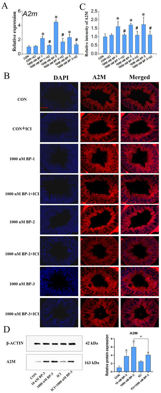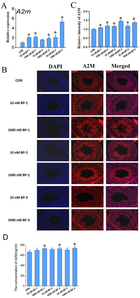 The mRNA levels of A2m in all doses of BP-1, BP-2, and BP-3 were significantly elevated compared with those in the control mouse testes at PND 56 (all p < 0.05), with the exception of 10 nM BP-2 (Figure 2A). At the in situ protein level, the fluorescent signal of A2M expression showed an increasing trend in all doses of BP-1, BP-2, and BP-3 relative to the control (Figure 2B). The quantitative analysis results indicate that the relative intensity of A2M was significantly increased in a dose-dependent manner in the mouse testes compared with the control (p < 0.05) (Figure 2C). In addition, the measured concentrations of A2M were higher in serum samples of mice at PND 56 following exposure to all doses of BP-1, BP-2, and BP-3 than those in the control, with significant difference in the 1000 nM BP-1, BP-2, and BP-3 groups (p < 0.05) (Figure 2D).