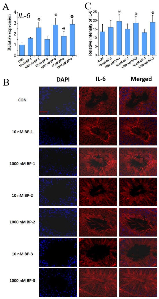 The effects of BP exposure on the expression level of IL-6 in mouse testes (PND1–PND56) (A). Relative mRNA expression level (qPCR). (B). In situ protein expression level (IF assay). (C). Quantitative analysis of IF assay results. Scale bar: 50 μm. Data are expressed as mean ± SD. * Indicates significant differences between BP groups and the control group (p < 0.05).