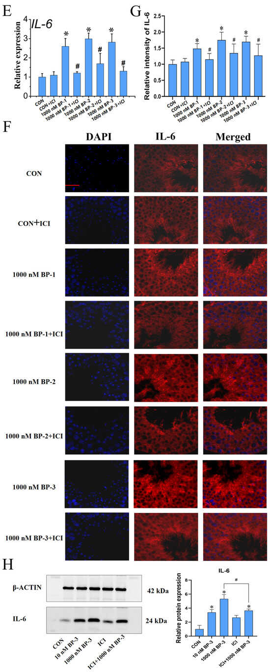 Figure 4E–H represent the antagonistic effect of ICI 182780 intervention on the upregulation of IL-6 in mouse testicular tissue induced by BP exposure. Exposure to 1000 nM concentrations of BPs resulted in a significant increase in the relative expression of IL-6 compared with the control group in testes of mice at PND 56 (p < 0.05). The expression of IL-6 was not significantly altered by exposure to ICI 182780 alone. Significantly, ICI 182780 intervention could significantly reverse the upregulation of IL-6 gene expression caused by 1000 nM BPs (p < 0.05) (Figure 4E). Similarly, at the in situ protein level, the presence of ICI 182780 appeared to counteract the increased effects of 1000 nM BPs on IL-6 expression (p < 0.05) (Figure 4F). Further analysis revealed that ICI 182780 significantly reduced the relative intensities of IL-6 in response to BP exposure (p < 0.05) (Figure 4G). WB analysis revealed that 10 and 1000 nM BP-3 increased A2M protein levels, with 1000 nM BP-3 showing significant changes. ICI 182780 alone had no effect, but it significantly reversed BP-3’s effect at 1000 nM (p < 0.05) (Figure 4H).