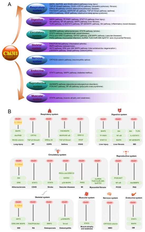 APA StyleLiu, D., Hu, X., Ding, X., Li, M., & Ding, L. (2024). Inflammatory Effects and Regulatory Mechanisms of Chitinase-3-like-1 in Multiple Human Body Systems: A Comprehensive Review. International Journal of Molecular Sciences, 25(24), 13437. https://doi.org/10.3390/ijms252413437