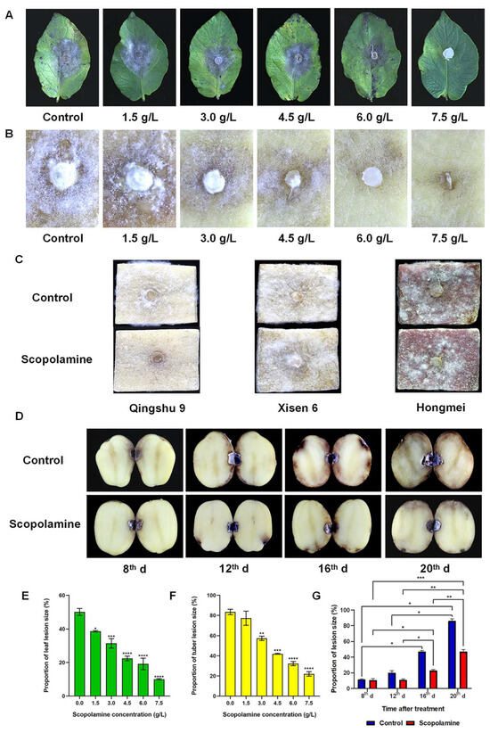 Scopolamine induces potatoes to resist late blight. Late blight symptoms of ‘Favorita’ potato leaves (A) and pieces (B) pretreated with different concentrations of scopolamine. (C) Late blight symptoms of ‘Qingshu 9’, ‘Xisen 6’, and ‘Hongmei’ potato pieces pretreated with scopolamine. (D) Symptoms of late blight in whole ‘Marco’ potatoes with or without scopolamine treatment. Proportion of lesion size of ‘Favorita’ potato leaves (E), pieces (F), and whole ‘Marco’ potatoes (G). d: days post inoculation with P. infestans. Tukey’s multiple comparisons test * p < 0.0332, ** p < 0.0021, *** p < 0.0002, **** p < 0.0001. 3 replicates per group.