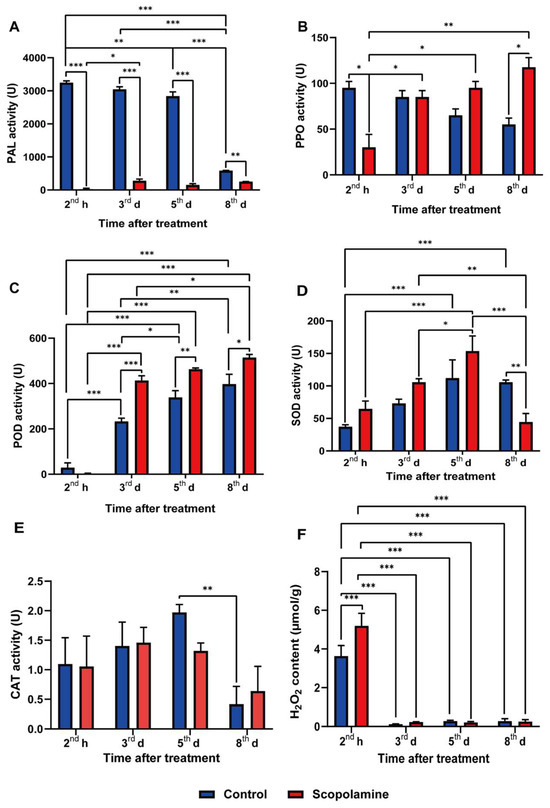 Change of disease-resistant substances in potato tubers with or without scopolamine treatment. (A) Phenylalanine ammonia (PAL) activity, (B) polyphenols oxidase (PPO) activity, (C) peroxidase (POD) activity, (D) superoxide dismutase (SOD) activity, (E) catalase (CAT) activity, (F) H2O2 content in control group and scopolamine-treated group. h: hours after scopolamine treatment. d: days post-inoculation with P. infestans. Three replicates per group. Values represent the means ± standard error of 3 independent samples (Tukey’s multiple comparisons test, * p < 0.0332, ** p < 0.0021, *** p < 0.0002).