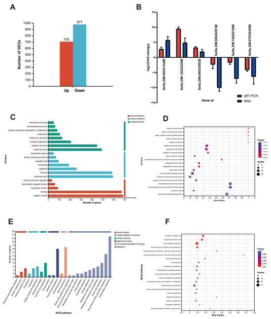 Main information of transcriptome sequencing in potato tubers under scopolamine treatment. (A) Distribution of differentially expressed genes. (B) qRT-PCR result. (C) GO annotation analysis diagram. The X–axis represents the number of genes compared to the secondary classification. (D) GO enrichment analysis. The horizontal axis represents the ratio of sample number of genes enriched in the rich factor (GO term) to the background number of annotated gene, and the color of the dot corresponds to different p-adjust ranges. (E) Histogram of KEGG. The X–axis is the number of genes annotated to the pathway. (F) KEGG enrichment analysis. The horizontal axis represents the ratio of rich factor (sample number of genes enriched in this pathway to background number of annotated genes). Three replicates per group.