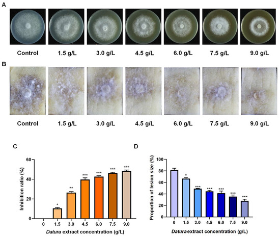 The 6-mm-diameter mycelia disks were inoculated in the center of the solid rye glucose medium added with the concentrations of 0, 1.5, 3.0, 4.5, 6.0, 7.5 and 9.0 g/L Datura extract. Each concentration group had four replicates, and the mediums were cultured at 20 °C of darkness. After 10 d, photos were taken to record the colony morphology. The colony diameter was determined by cross method, and the inhibition ratio was calculated by the following formula: