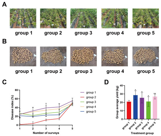 Q values < 0.85, 0.85–1.15 and ≥1.15 indicate antagonism, additive effects, and synergism, respectively. All treatments required three repetitions. The harvested healthy potatoes were divided into non-commodity potatoes and commodity potatoes (≥100 g), and the commodity potato rate and yield increase rate were calculated.
