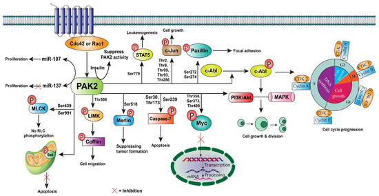 Phosphorylation of the substrate proteins by PAK2 regulates various cellular functions. PAK2 phosphorylates key proteins that are involved in cell cycle, apoptosis, and motility. Akt: Ak strain transforming; Bcl-2: B-cell lymphoma 2; Bad: Bcl-2 associated agonist of cell death; c-Abl: Abelson murine leukemia viral homolog 1; Cdc42: Cell division cycle 42, CDK2: cyclin-dependent kinase 2; LIMK: LIM kinase; MLCK: myosin light-chain kinase; MAPK: mitogen-activated protein kinase; miR: microRNA; Myc: myelocytomatosis oncogene; PI3K: phosphoinositide 3-kinases; Rac1: Ras-related C3 botulinum toxin substrate 1; RLC: regulatory light chains; STAT5: signal transducer and activator of transcription 5.