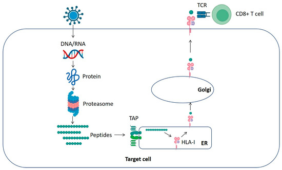 In infected cells, viral proteins with synthesis or folding defects are targeted for proteolytic degradation by cytosolic proteases, mainly different types of proteasomes (standard, single intermediate proteasome, double intermediate proteasome, immunoproteasome, thymoproteasome, and spermatoproteasome, differing in subunit composition and cleavage specificity), generating a wide range of peptides of different sequences and lengths. Subsequently, some of these processed peptides are specifically translocated into the lumen of the endoplasmic reticulum (ER) by transporters associated with antigen processing. Peptides of 8 to 12 residues in length are efficiently translocated, but this transport becomes increasingly detrimental as the peptide length increases. Those peptides with the correct length (8 to 11 residues) and productive molecular interactions with specific residues of the antigen-binding site of the HLA class I molecule [6] can bind and stabilize the newly synthesized HLA class I molecules. These class I peptide/HLA complexes are exported through the endomembrane system to the cell surface, where they can interact with CD8+ T-cell receptors (Figure 1) [7]. Efficient recognition of viral ligands bound to HLA class I molecules by these CD8+ T lymphocytes can lead to the beneficial death of pathogen-infected cells as usual in protective antiviral immune responses or, conversely, induce autoimmune damage such as HLA-B27-restricted autoreactive cytolytic T cells associated with ankylosing spondylitis, psoriatic arthritis, and other spondyloarthropathies [8].