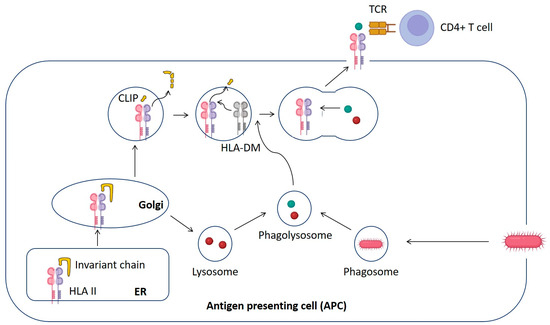 In contrast, HLA class II molecules synthesized by antigen-presenting cells associate with the invariant (Ii) class II chain in the endoplasmic reticulum. These stabilized complexes, without bound antigenic peptides, are transported directly to different specialized endosomal compartments where the Ii chain is progressively proteolyzed until only a fragment known as the class II-associated invariant chain peptide (CLIP) remains. CLIP interacts with the antigen-binding site of the HLA class II molecule to prevent binding of pathogenic peptides from endogenous HLA class I pathways. Next, interaction of CLIP/HLA class II complexes with the accessory molecule HLA-DM induces conformational changes in the HLA class II molecules, and subsequent release of CLIP from this HLA molecule exposes the antigenic peptide binding site. This HLA-DM protein acts as a chaperone that stabilizes HLA class II molecules without CLIP, to ensure binding to high-affinity peptides. This organelle fuses with late endosomes containing exogenous protein material, such as extracellular host proteins and/or viral particles previously engulfed by phagocytosis, endocytosis, or pinocytosis. This exogenous material is processed by various lysosomal resident cathepsins. This results in viral peptides of varying length [9]. Finally, the binding of these antigenic peptides of different lengths (up to 30 residues long), which interact productively with specific residues of the antigen-binding site of the HLA class II molecule, stabilizes these class II peptide/HLA complexes, allowing their subsequent transport to the cell membrane, where they can be recognized by CD4+ T lymphocyte receptors (Figure 2) [9]. The recognition of viral ligands bound to HLA class I molecules triggers multiple immune activities, including secretion of cytokines, B-cell antibody class switch, and the growth and activation of cytolytic T lymphocytes, thereby increasing the bactericidal activity of phagocytic cells.
