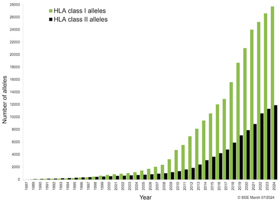Identification of HLA class I and II genetic polymorphisms by year. Number of alleles named and included in the IPD-IMGT/HLA Database since 1987 [13].