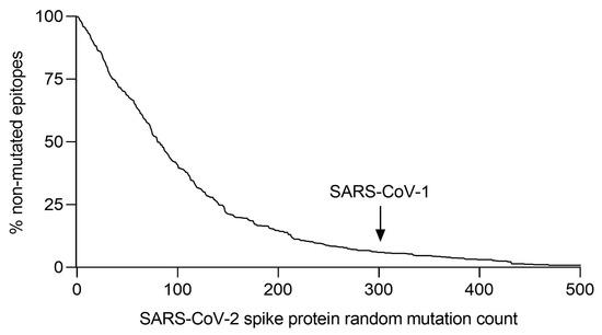 Percentage of conserved epitopes in the SARS-CoV-2 spike protein after increasing random mutagenesis. The number of non-mutated epitopes for the 551 HLA class alleles most prevalent in the human population was calculated after random progressive position sets ranging from 1 and 500 positions, i.e., the length of the full spike protein (adapted from [28]). For comparison, the arrow indicates the 304 amino acid changes between SARS-CoV-1 and SARS-CoV-2.