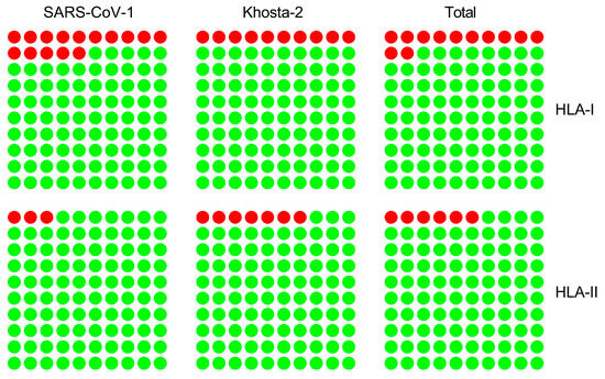 Predicted versus experimentally detected HLA class I and II epitopes conserved among sarbecoviruses. Percentage of predicted experimentally detected HLA class I (top panels) or predicted HLA class II (bottom panels) epitopes (green dots) or not (red dots) between SARS-CoV-1 and SARS-CoV-2 (left panels), Khosta-2 and SARS-CoV-2 (middle panels), and the sum of both studies (right panels). The HLA class I and II alleles included in this comparison cover > 60% of the world’s population, regardless of ethnic origin. Adapted from [41,42].
