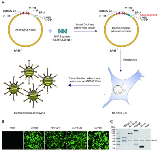 2.1. Recombinant Adenovirus Expressing UL18, UL25, and gB Protein in 293T Cells