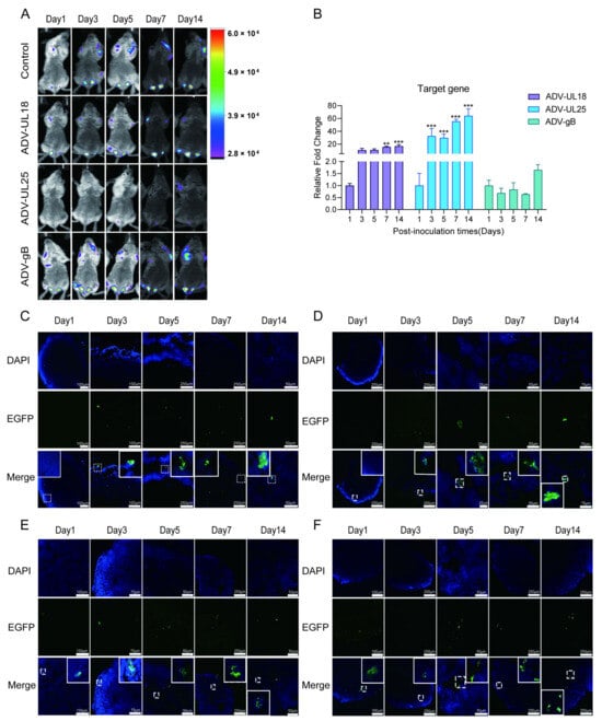 The expression of recombinant adenoviruses ADV-UL18, ADV-UL25, and ADV-gB in vivo. (A) In vivo imaging detects protein expression in mice. The mice were intranasally inoculated with recombinant adenovirus. Red in the heat map indicates relatively high expression levels, while purple indicates relatively low expression levels. (B) Transcription of UL18, UL25, and UL27 (gB) genes in the lymph nodes of mice inoculated intranasally with recombinant adenovirus. (C) Detection of EGFP protein expression in the lymph nodes by immunofluorescence. (D) Detection of UL18 protein expression in the lymph nodes by immunofluorescence. (E) Detection of UL25 protein expression in the lymph nodes by immunofluorescence. (F) Detection of gB protein expression in the lymph nodes by immunofluorescence. The relative Ct (ΔΔCt) method was used to normalize the relative expression levels of mRNA at each time point in each group to the corresponding mRNA expression level on day 1 in each group. The Scheir–Ray–Hare test was performed. Data are presented as the mean ± SD based on data from three independent experiments. ** p < 0.01, *** p < 0.001.