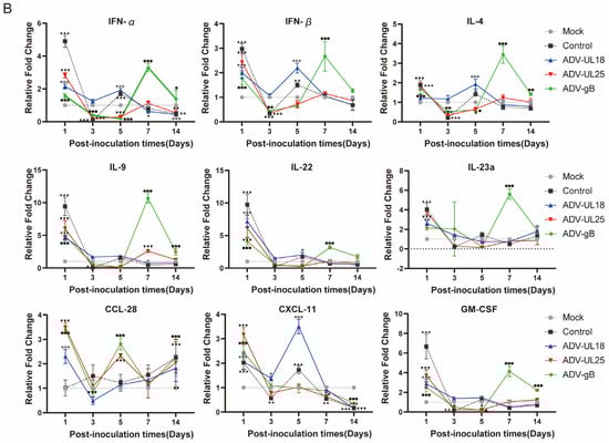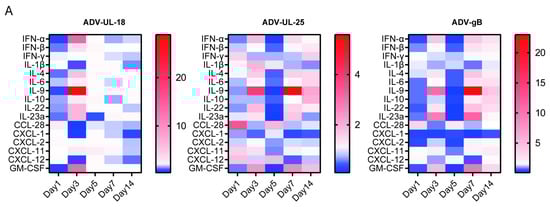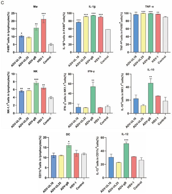 Innate immune response triggered by UL18, UL25, and gB in mice. (A) Heatmap showing the expression of innate immune factors at different time points after inoculation with recombinant adenovirus. The data for each group were compared with the control group (inoculated with blank adenoviral vector). (B) Expression of nine major factors at different time points after inoculation with recombinant adenovirus. The comparative Ct (ΔΔCt) method was utilized to standardize the relative mRNA expression levels in the experimental group to those of the mock group (the naïve mice group) at each time point. The Scheir–Ray–Hare test was conducted. Data are presented as the mean ± SD based on three independent experiments. ▲, Control vs. Mock. *, ADV-UL18 vs. Mock. ▼, ADV-UL25 vs. Mock. ●, ADV-gB vs. Mock. ▲ p < 0.05, ▲▲ p < 0.01, ▲▲▲ p < 0.001; * p < 0.05, ** p < 0.01, *** p < 0.001; ▼ p < 0.05, ▼▼ p < 0.01, ▼▼▼ p < 0.001; ● p < 0.05, ●● p < 0.01, ●●● p < 0.001. (C) The percentage of innate immune cells among total lymphocytes in the spleen of mice and the factors they secrete on the third day after inoculated with recombinant adenovirus. The data for each group were compared with the control group (inoculated with blank adenoviral vector). * p < 0.05, ** p < 0.01, *** p < 0.001.