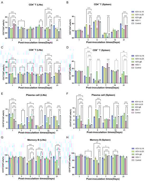 Effects of UL18, UL25, and gB on T- and B-cell subsets in mice. (A) Percentage of CD4+ T cells out of total T cells in the lymph nodes. (B) Percentage of CD4+ T cells out of total T cells in the spleen. (C) Percentage of CD8+ T cells out of total T cells in the lymph nodes. (D) Percentage of CD8+ T cells out of total T cells in the spleen. (E) Percentage of plasma cells out of total B cells in the lymph nodes. (F) Percentage of plasma cells out of total B cells in the spleen. (G) Percentage of memory B cells out of total B cells in the lymph nodes. (H) Percentage of memory B cells out of total B cells in the spleen. The Scheir–Ray–Hare test was conducted. Data are presented as the mean ± SD based on data from two independent experiments. Data at each time point in each group were compared with those of the control group (inoculated with a blank adenovirus vector). * p < 0.05, ** p < 0.01, *** p < 0.001.