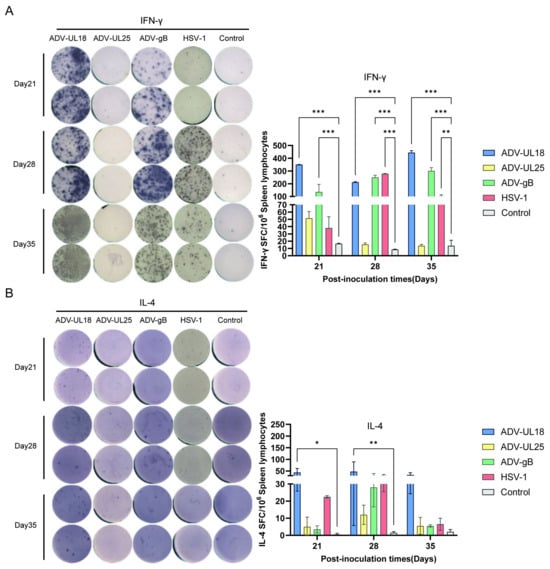 Analysis of specific T-cell responses elicited by UL18, UL25, and gB using ELISpot assay. (A) Statistical analysis of spots (left) and numbers (right) in each well on the IFN-γ ELISpot plate. (B) Statistical analysis of spots (left) and numbers (right) in each well on the IL-4 ELISpot plate. Stimulants: UL18 recombinant protein (3 µg/well) in the ADV-UL18 group, UL25 recombinant protein (3 µg/well) in the ADV-UL25 group, gB recombinant protein (3 µg/well) in the ADV-gB group, UL18 + UL25 + gB recombinant proteins (1 µg/well per protein, total 3 µg/well) in the control group and HSV-1 group. The data at each time point in each group were compared with those of the control group (inoculated with a blank adenovirus vector). * p < 0.05, ** p < 0.01, *** p < 0.001.