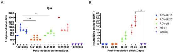 To further explore the impact of the proteins encoded by UL18, UL25, and gB on antibody production in the humoral immune response of mice, sera were collected from mice intranasally inoculated with ADV-UL18, ADV-UL25, and ADV-gB on days 14, 21, 28, and 35 for specific IgG antibody detection via ELISA. Starting from day 14, all three proteins induced specific IgG antibodies. From days 21 to 28, the levels of specific IgG antibodies induced by UL18 (GMT ≥ 800) were significantly higher than those induced by UL25 (GMT ≤ 200) and gB (GMT ≤ 800), remaining elevated (GMT ≥ 400) until day 35. Furthermore, on day 21, the specific antibody level induced by UL18 (800 ≤ GMT ≤ 1600) surpassed that induced by HSV-1 (GMT = 800) (Figure 6A). Neutralizing antibodies were also evaluated on days 28 and 35. We observed that the specific antibodies induced by UL18 and UL25 were unable to neutralize the McKrae strain (GMT < 4). Only the ADV-gB or HSV infection could elicit neutralizing antibodies, as expected (Figure 6B).