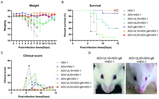 Mice were randomly divided into seven groups and intranasally immunized with ADV (an empty adenovirus vector), recombinant adenoviruses ADV-UL18, ADV-UL25 and ADV-gB (7 × 109 VP/10μL/mouse), ADV-UL18 + ADV-gB (3.5 × 109 VP ADV-UL18 + 3.5 × 109 VP ADV-gB/10 μL/mouse), and ADV-UL25 + ADV-gB (3.5 × 109 VP ADV-UL25 + 3.5 × 109 VP ADV-gB/10 μL/mouse). The blank control group received intranasal administration of PBS (10μL/mouse). At 21 days post-immunization, all mice were challenged with the HSV-1 wild-type strain McKrae (2 × 104 CCID50/10 μL/mouse) via the intranasal route. Mice were weighed and observed for clinical symptoms daily (n = 10/group). The survival rate was assessed, and clinical scores were evaluated on the basis of an established scoring criterion (0, healthy; 1, inverted hair/back arching; 2, blindness; 3, limb paralysis; 4, death) over a 14-day period (n = 10/group). Tissue samples were obtained at 3, 5, and 7 days post-viral challenge for assessments of viral load and organ pathology (n = 3/group).
