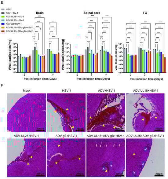 Protection elicited by UL18, UL25, and gB proteins in mice. (A) Changes in body weight of mice infected with HSV-1 (n = 10/group). (B) Survival rate of mice infected with HSV-1 (n = 10/group). The data of each group were compared with those of the HSV-1 group. ** p < 0.01, *** p < 0.001. (C) Total scores of clinical symptoms of HSV-1 infected mice in each group (0, healthy; 1, inverted hair/back arching; 2, blindness; 3, limb paralysis; 4, death) (n = 10/group). (D) Ocular symptoms of mice in the ADV-UL18 + ADV-gB and ADV-UL25 + ADV-gB groups after HSV-1 infection (blue arrow indicates blindness). (E) Viral load in the brain, spinal cord, and trigeminal ganglia (TG) of infected mice (n = 3/group). Data are presented as the mean ± SD from three independent mice. Data at each time point for each group were compared with those of the control group (ADV + HSV-1). *** p < 0.001. (F) Brain histopathology analysis by H&E staining (n = 3/group) (yellow arrow indicates tissue bleeding; blue arrow indicates inflammatory cell infiltration).